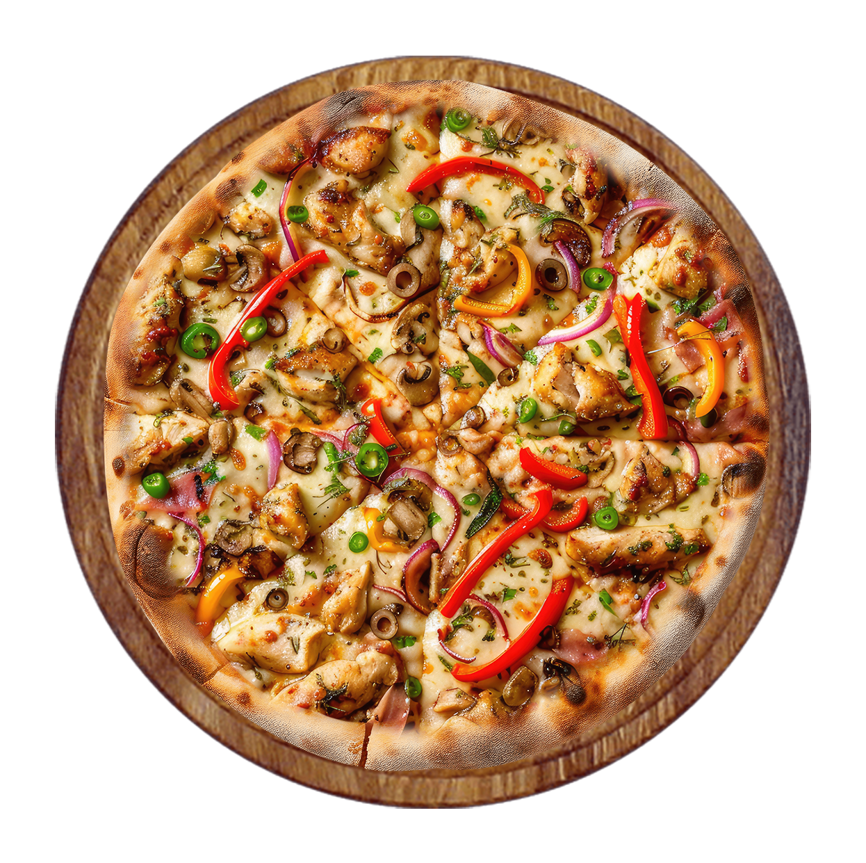 Sauce barbecue, mozzarella, champignons, poulet, chorizo, poivrons.