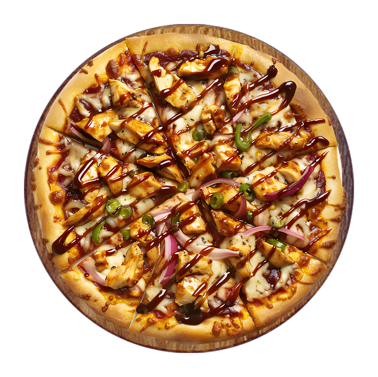 Sauce barbecue, mozzarella, champignons, poulet, chorizo, poivrons.