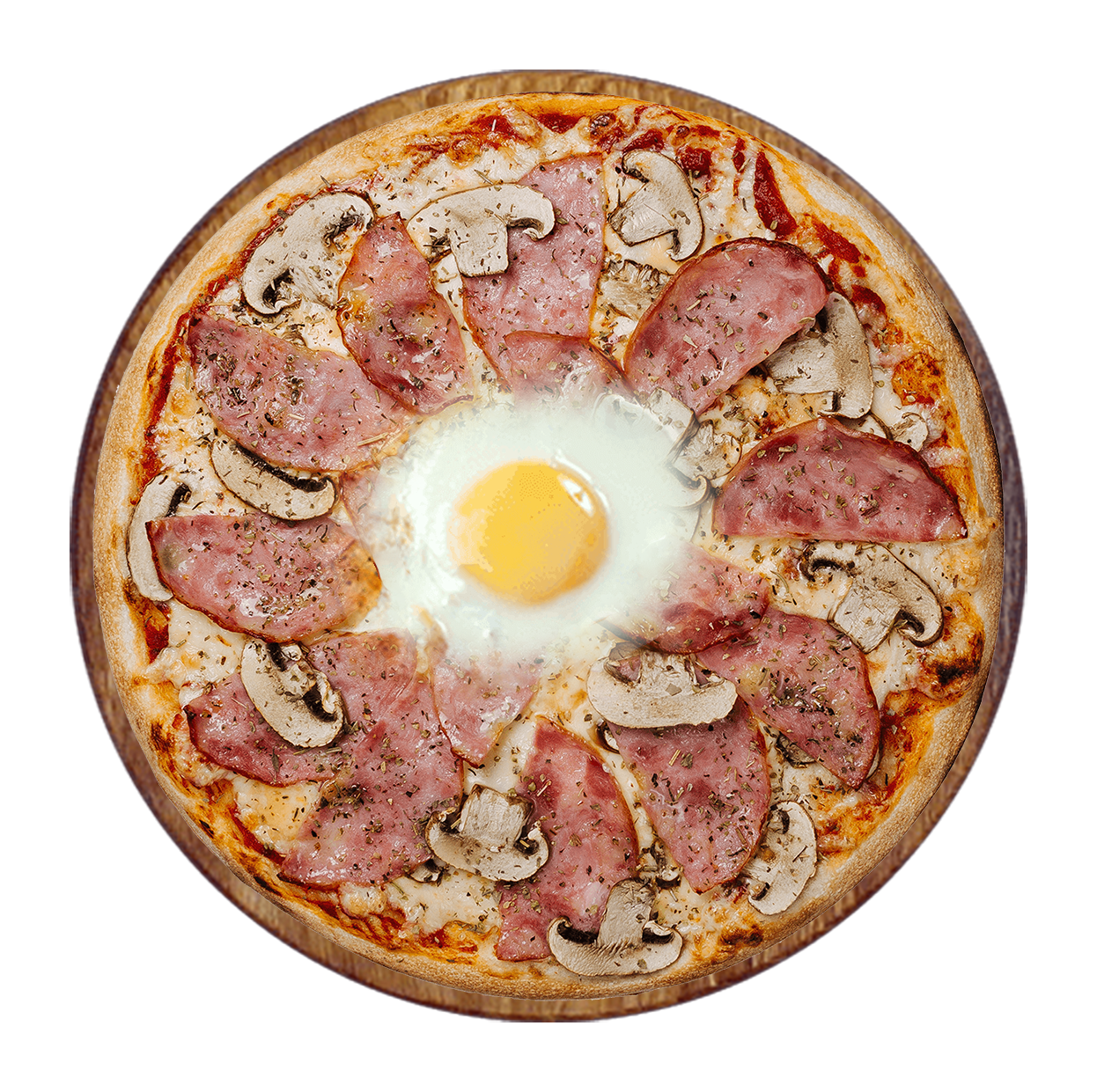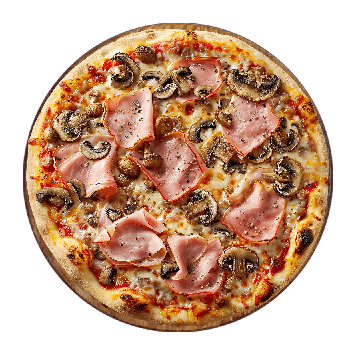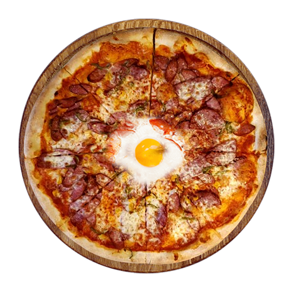 Sauce tomate, mozzarella, champignons, jambon, chorizo, merguez, oeuf.