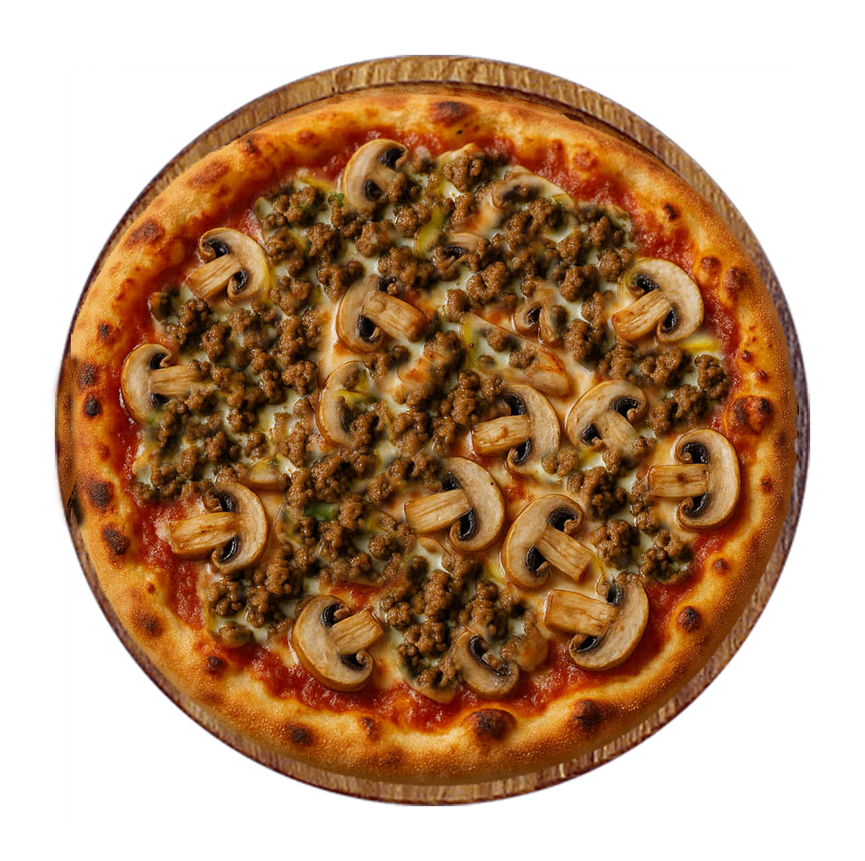 Sauce tomate, mozzarella, viande hachée, champignons.