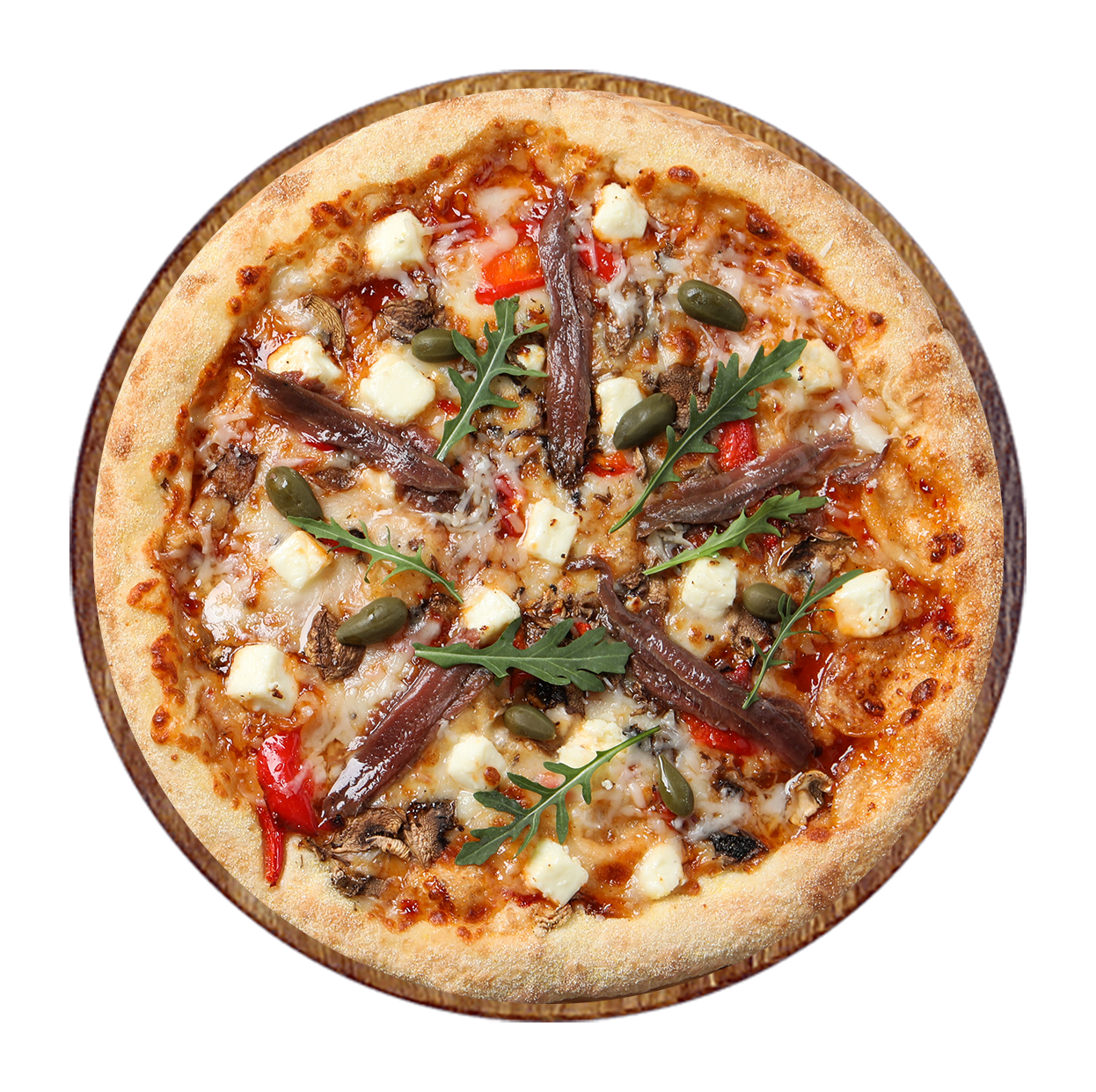 Sauce tomate, mozzarella, anchois, câpres, olives.
