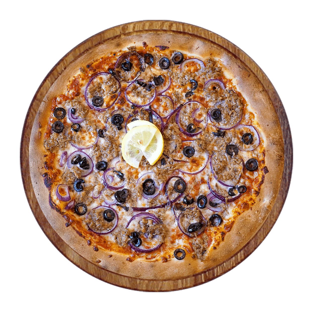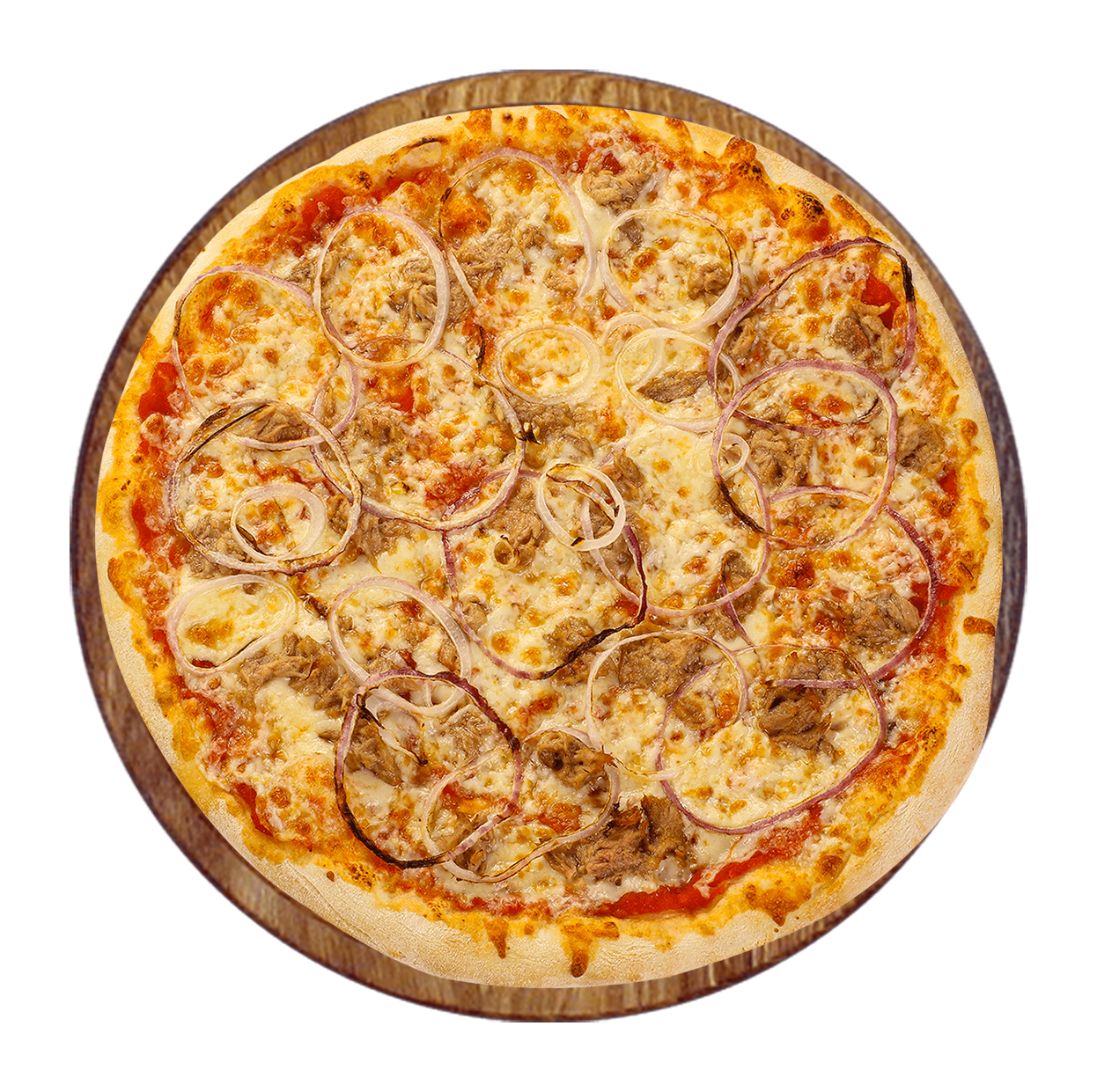 Sauce tomate, mozzarella, thon, oignons, olives.