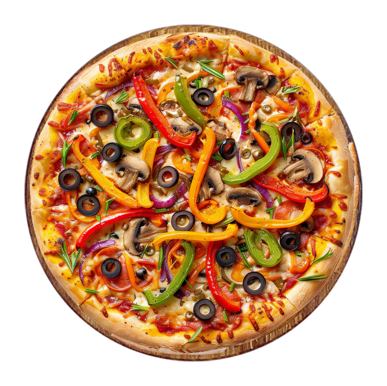 Sauce tomate, mozzarella, champignons, oignons, poivrons, olives.