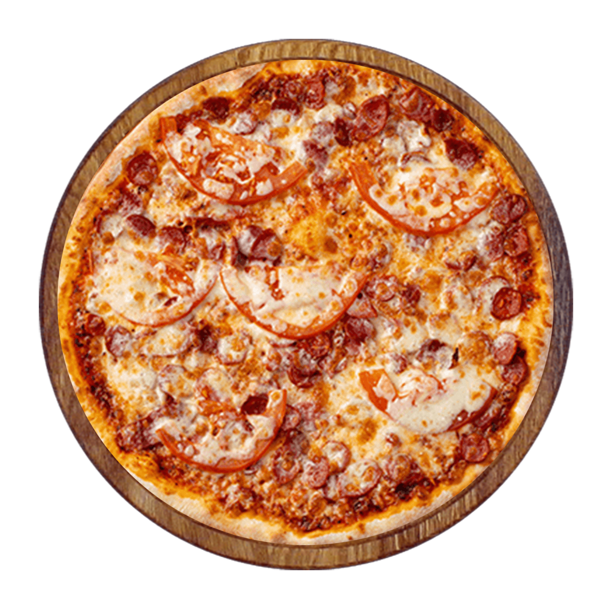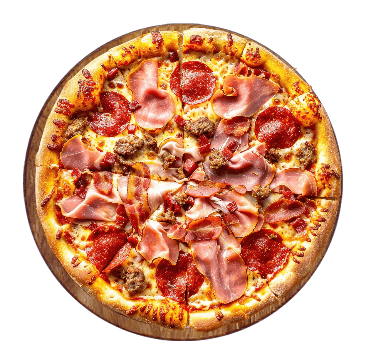 Sauce tomate, mozzarella, jambon, bacon, chorizo.