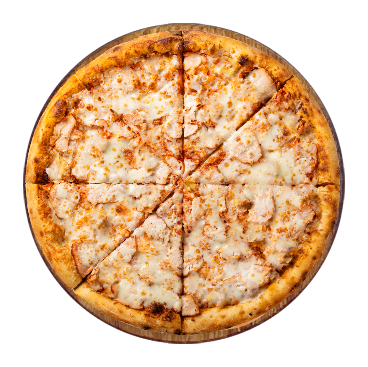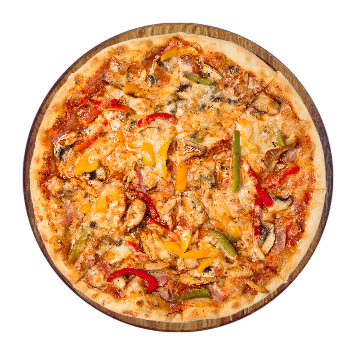 Sauce tomate, mozzarella, champignons, poulet, poivrons.