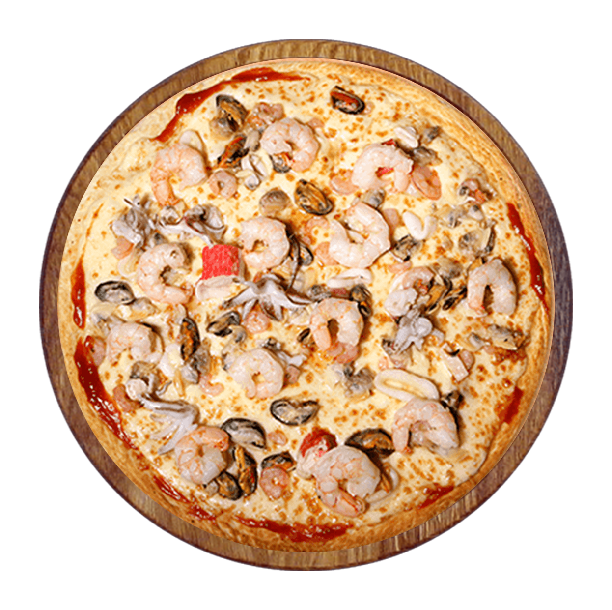 Sauce tomate, mozzarella, moules, calamars, crevettes.