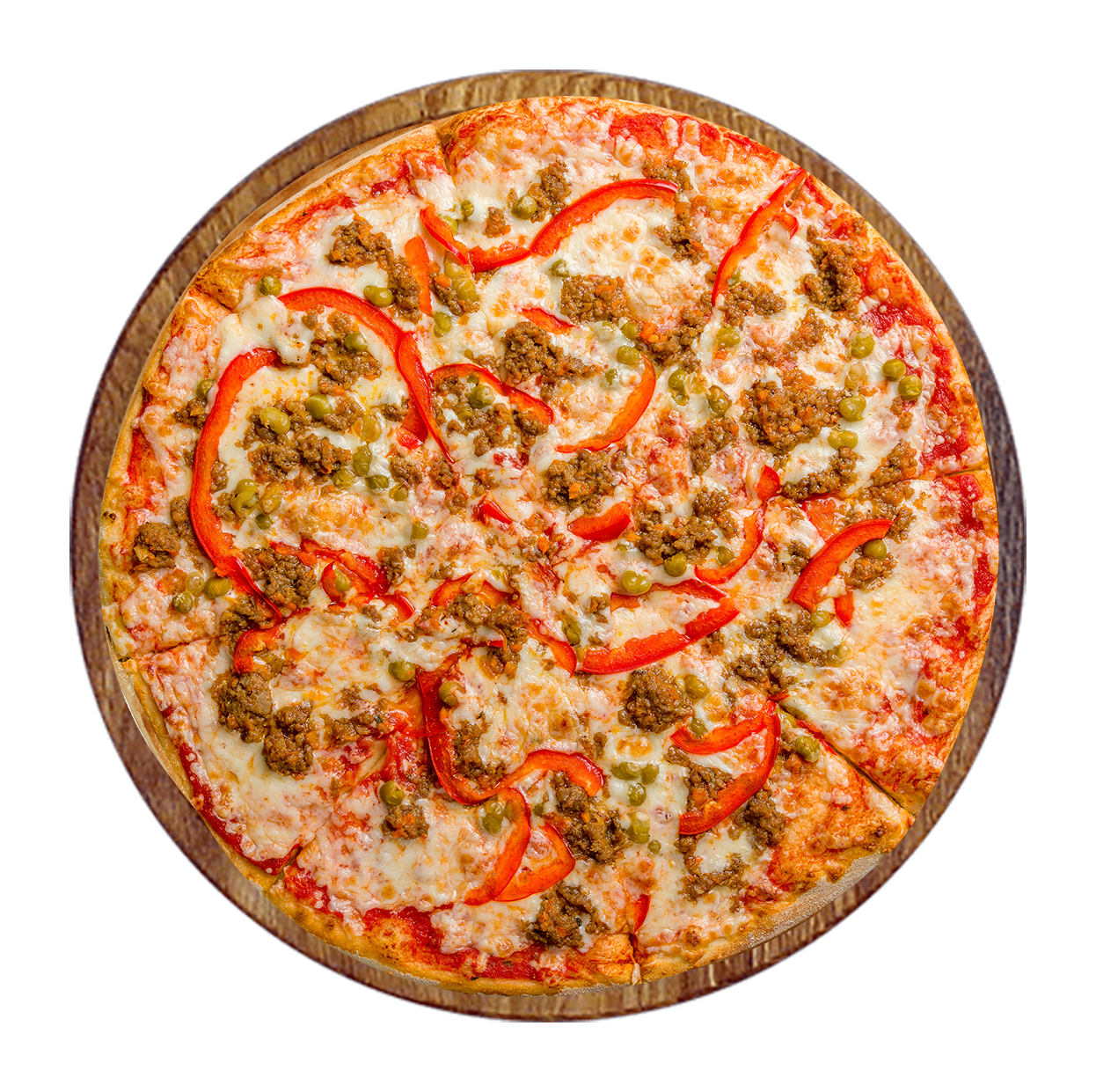Sauce tomate, mozzarella, viande hachée, poulet, merguez, poivrons.